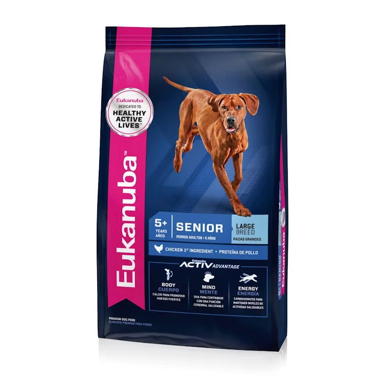Eukanuba Senior Large Breed es un alimento balanceado completo para perros adultos de más de 5 años de edad y de razas grandes o gigantes como : Labrador Retriever, Ovejero Alemán, Golden Retriever, Boyero de Berna, Cane Corso, Dogo de Burdeos, Bullmastiff y otras razas o perros mestizos que en su etapa adulta pesan más de 25 kg (razas grandes) o más de 50 kg (razas gigantes).