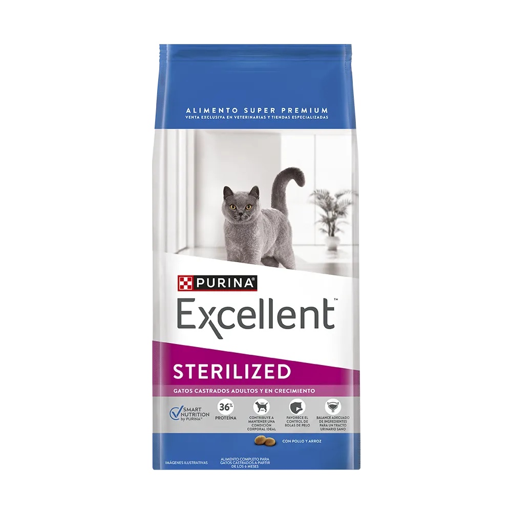 Los gatos castrados, sean adultos o estén en crecimiento necesitan una nutrición especifica. Purina Excellent Sterilized es un alimento completo y balanceado que ofrece una combinación de ingredientes adecuada para obtener una condición corporal ideal, ayudando en el control de bolas de pelo y manteniendo un tracto urinario saludable. Una óptima combinación de ingredientes que ayuda a mantener un pH adecuado en la orina, contribuyendo a la reducción de la formación de cálculos y cristales, y al mantenimiento de un tracto urinario saludable.