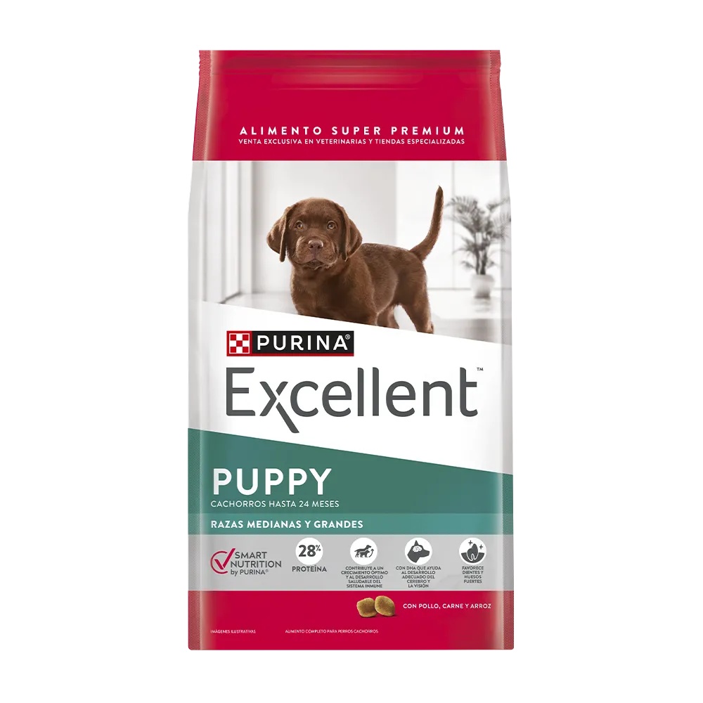 Purina Excellent le ofrece a tu cachorro una nutrición que favorece su desarrollo y crecimiento. Con proteínas de alta calidad y antioxidantes como la vitamina E y selenio, que contribuyen a fortalecer las defensas y a mantener un sistema inmune saludable. Con el sistema SMART NUTRITION Purina, que aporta múltiples beneficios científicamente comprobados, que mantienen a tu cachorro con un excelente estado de salud.