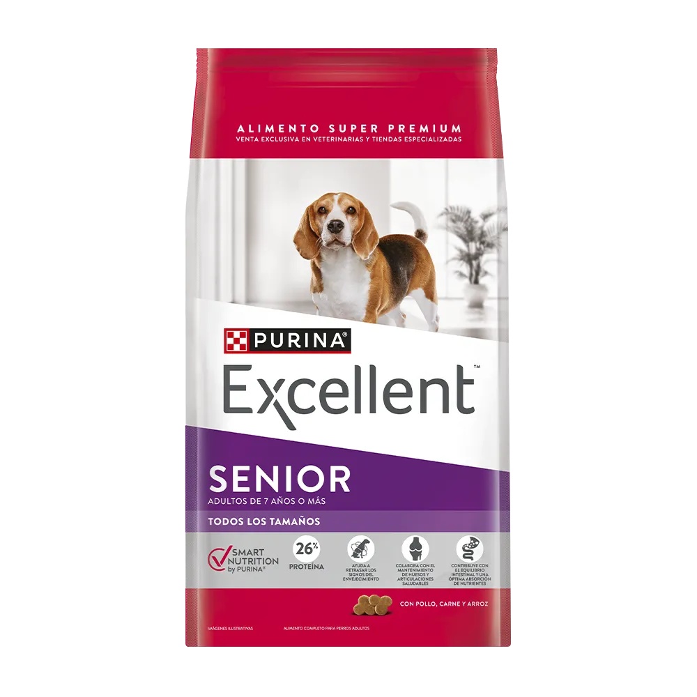 Purina Excellent le ofrece una fórmula con proteínas de alta digestibilidad y antioxidantes naturales, que ayudan a retrasar los signos del envejecimiento; y con fuentes naturales de glucosamina para mantener sus articulaciones saludables. Con el sistema SMART NUTRITION Purina, que aporta múltiples beneficios científicamente comprobados, que mantienen a tu perro adulto mayor con un excelente estado de salud.