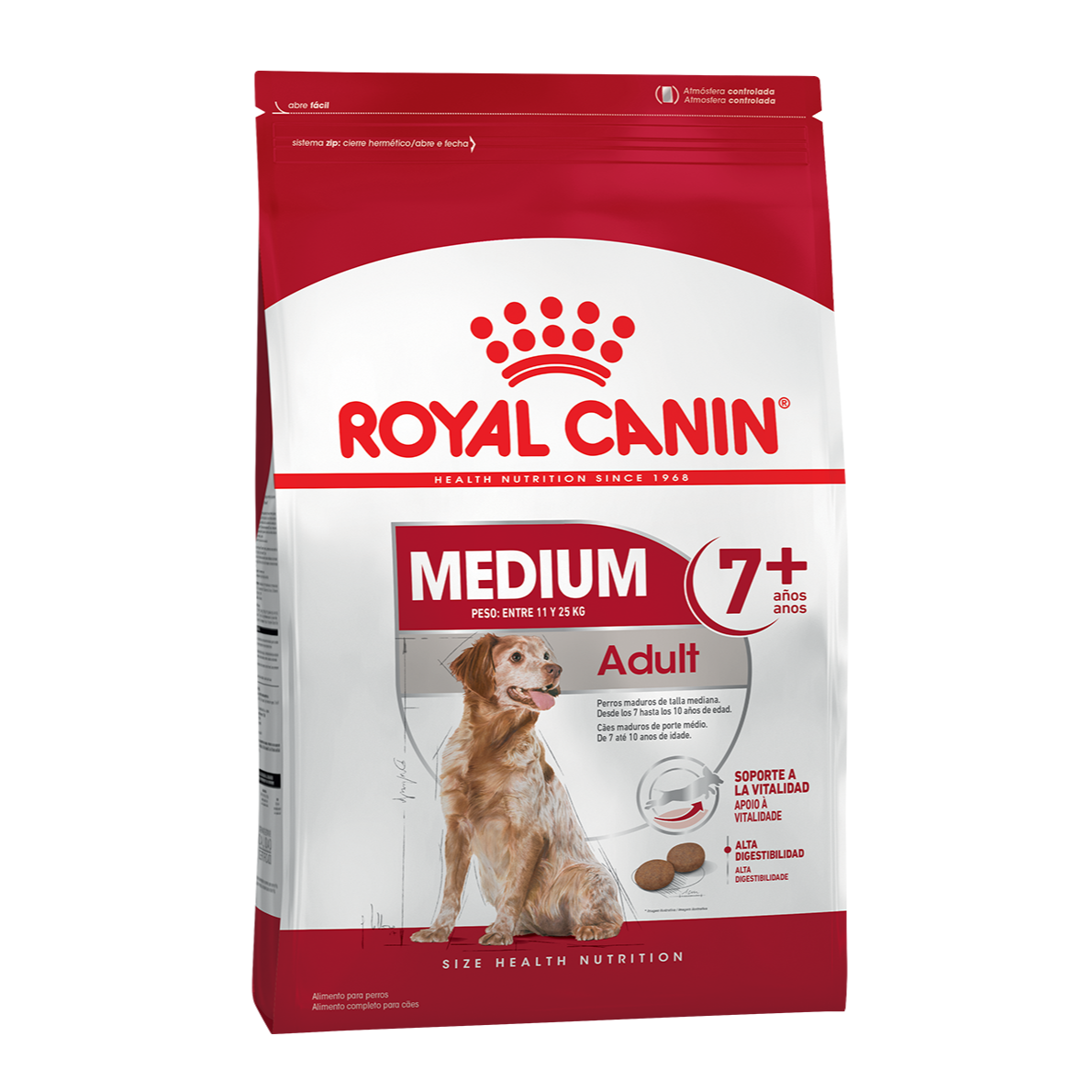 Royal Canin Medium Adulto 7+ contribuye a mantener la vitalidad, ayuda a promover una óptima digestibilidad, a mantener saludable la piel y el pelaje y a reducir la formación de sarro.