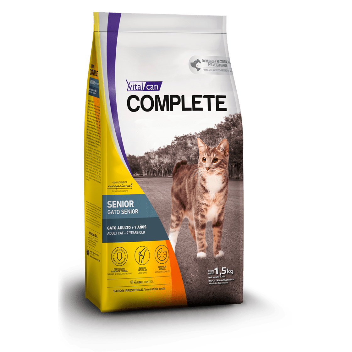 La línea de productos COMPLETE GATO es elaborada y formulada para cubrir los requerimientos nutricionales de los felinos en todas sus etapas de vida, así como también para satisfacer su exigente paladar. Además, VITALCAN COMPLETE se concentra en las características particulares de los gatos: Satisfaciendo sus altos requerimientos en proteínas de origen animal, colaborando con su salud bucal y de tracto urinario; y también prevé la formación bolas de pelos Una dieta pensada para una vida plena. Contribuye con la protección cardíaca, renal y articular y aporta un complejo antiage.